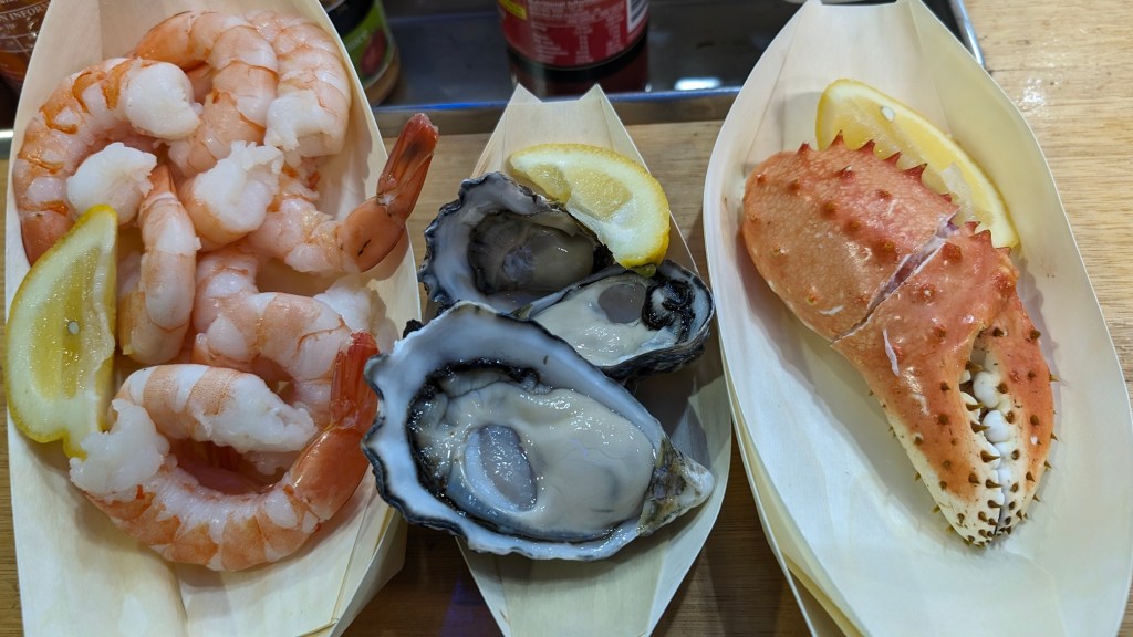 The ready to eat seafood options were outstanding! There are standing tables running down the center of the seafood hall with a variety of sauces for the ready to eat goodies.