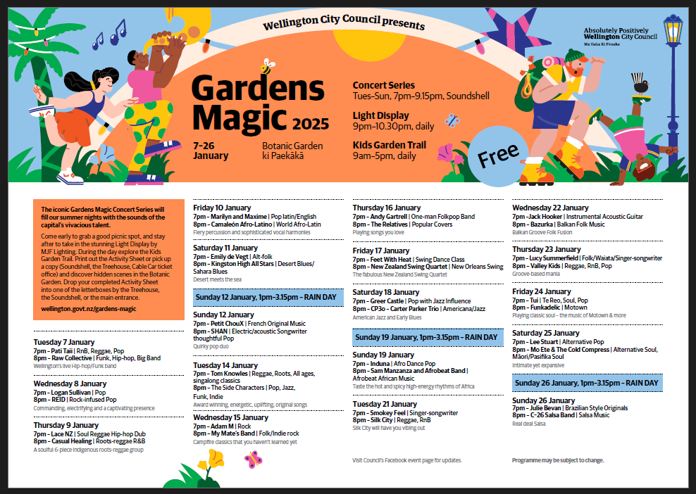 There is always something fun going on in Wellington! When I first arrived Gardens Magic was underway with live music followed by a light show in the Botanical Gardens every night for nearly 3 weeks in January. Click here to see the 2025 Gardens Magic Schedule.