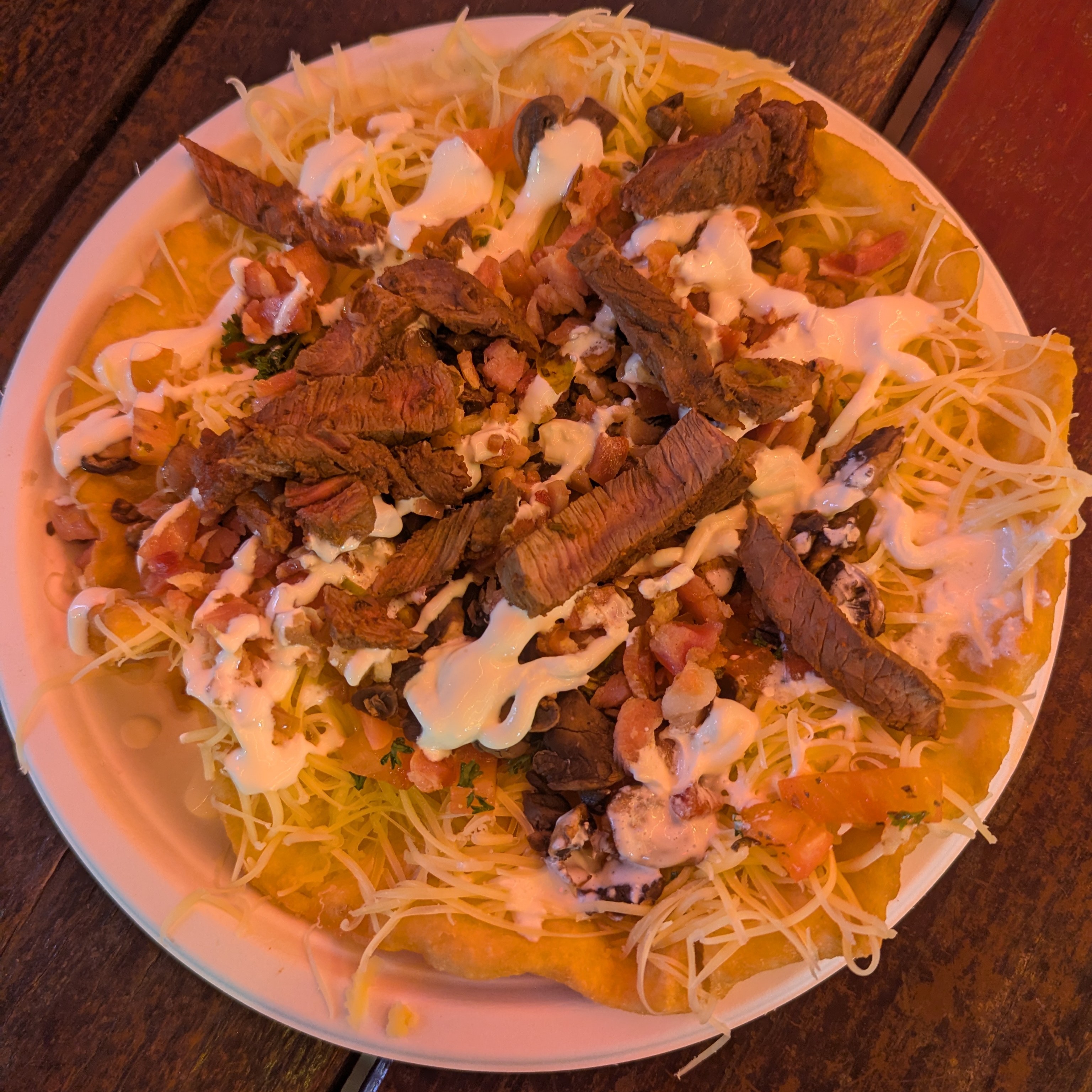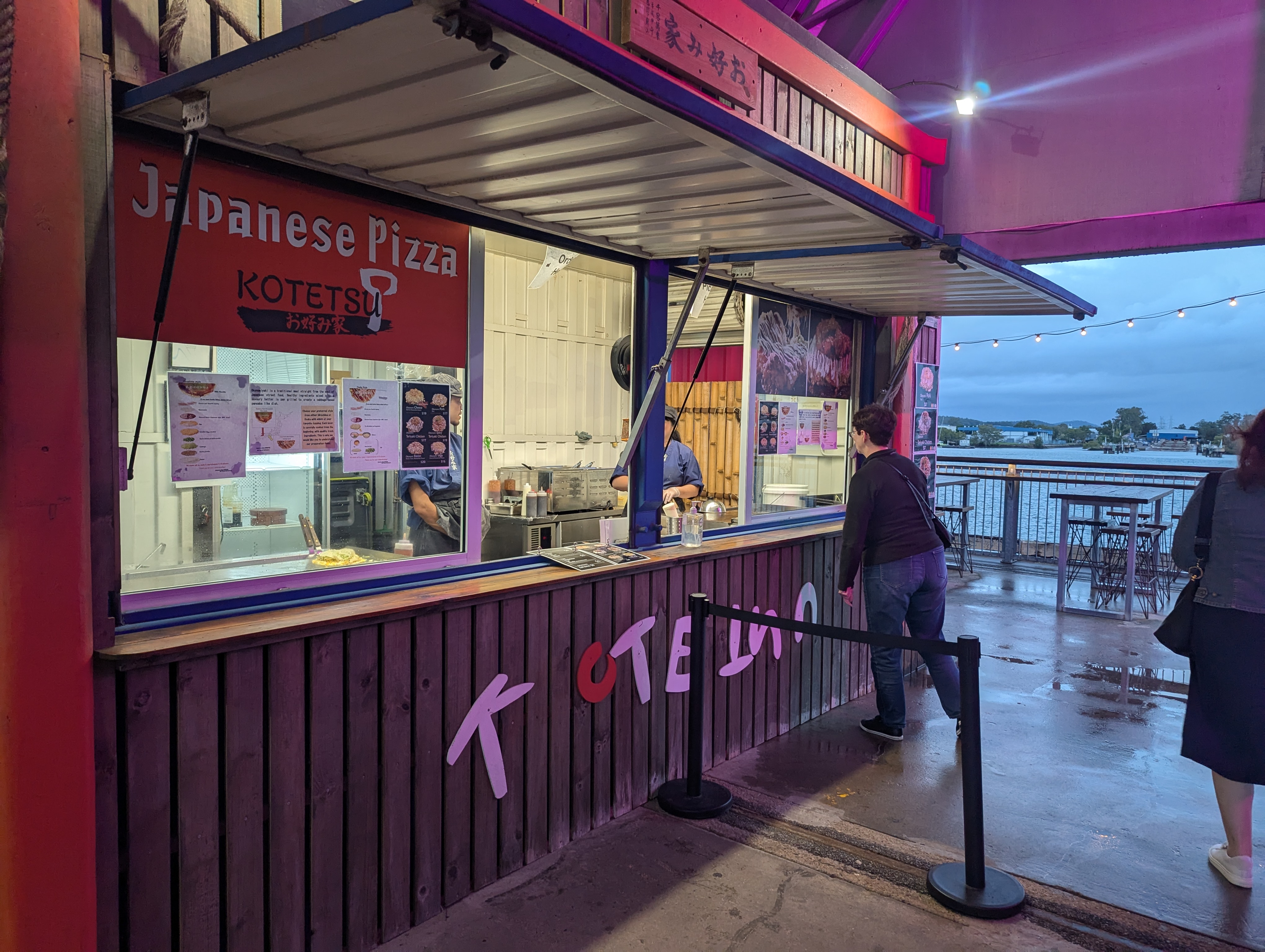 Fortunately, I was there with a couple of friends so we could share a few items. We ultimately settled on a loaded potato, crispy pork belly, Japanese pizza (which is really Okonomiyaki – more like an egg and cabbage omelet) and Hungarian flatbread.