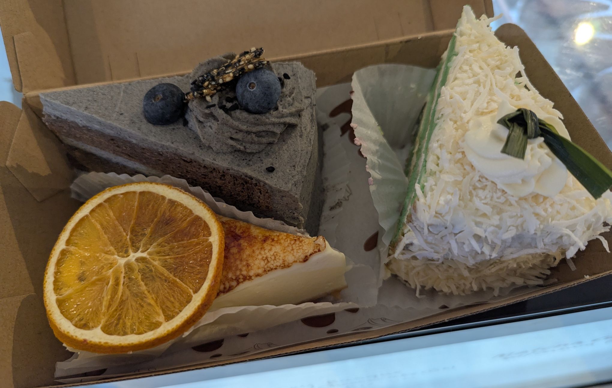 Nos Bakehouse wasn’t originally on our list, but we drove by and saw a long queue out front so we turned around and found a place to park. Because we were getting our food to takeaway we were able to jump to the front of the queue. They had a lovely selection of cakes influenced by asian flavors – something we really love! We chose Black Sesame, Pandan Coconut and Basque Cheesecake. We also got a teriyaki tofu sandwich for a vegetarian savoury option.