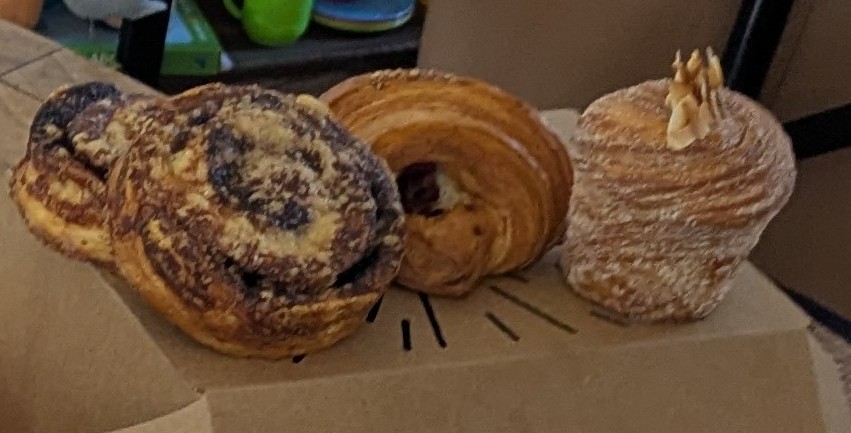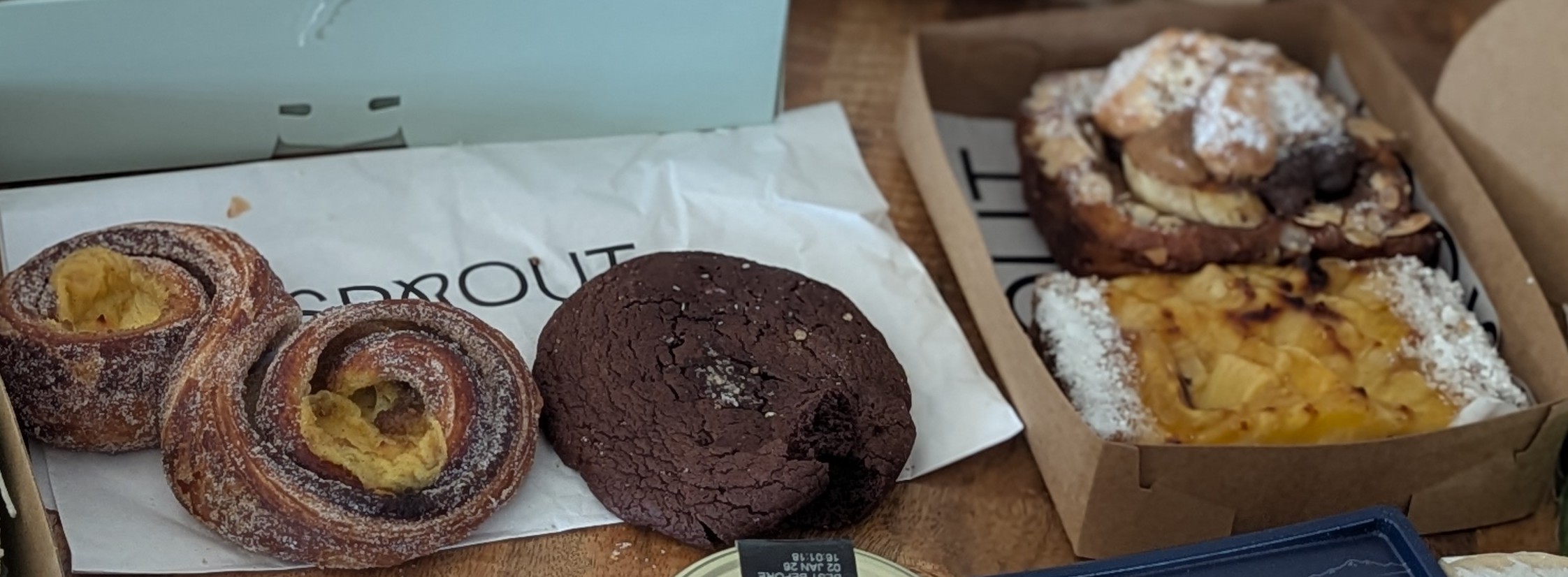 Sprout had a wonderful selection of croissants and pastries. We settled on seed bread, a cardamon custard bun, a chocolate cookie, a pineapple coconut tart, and the pastry of the day.